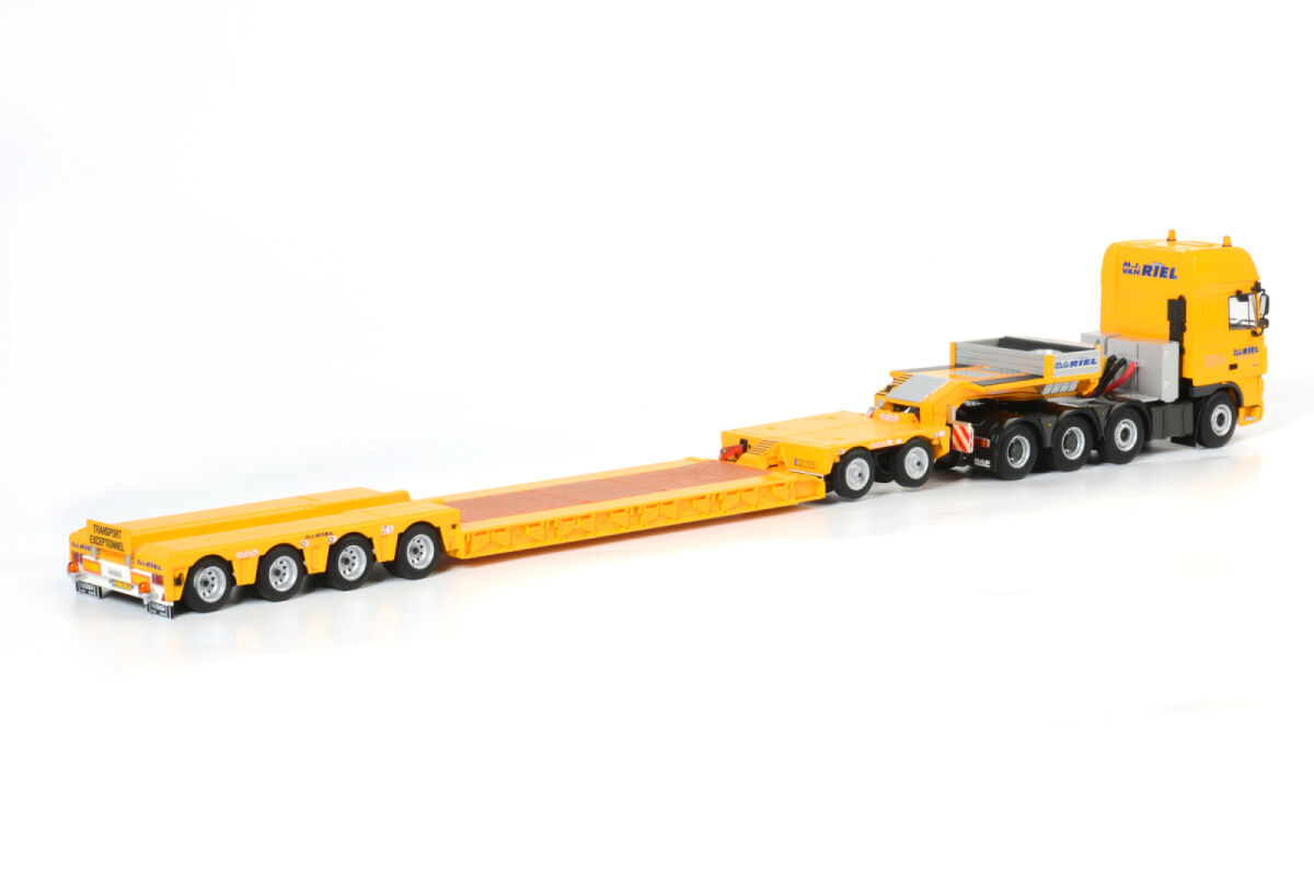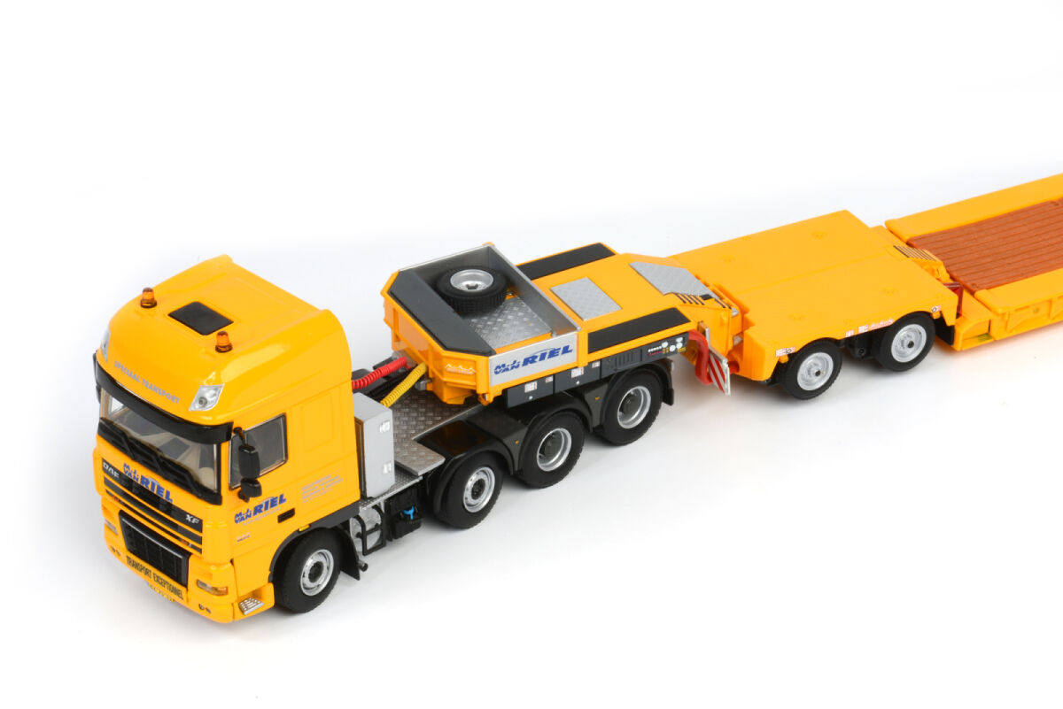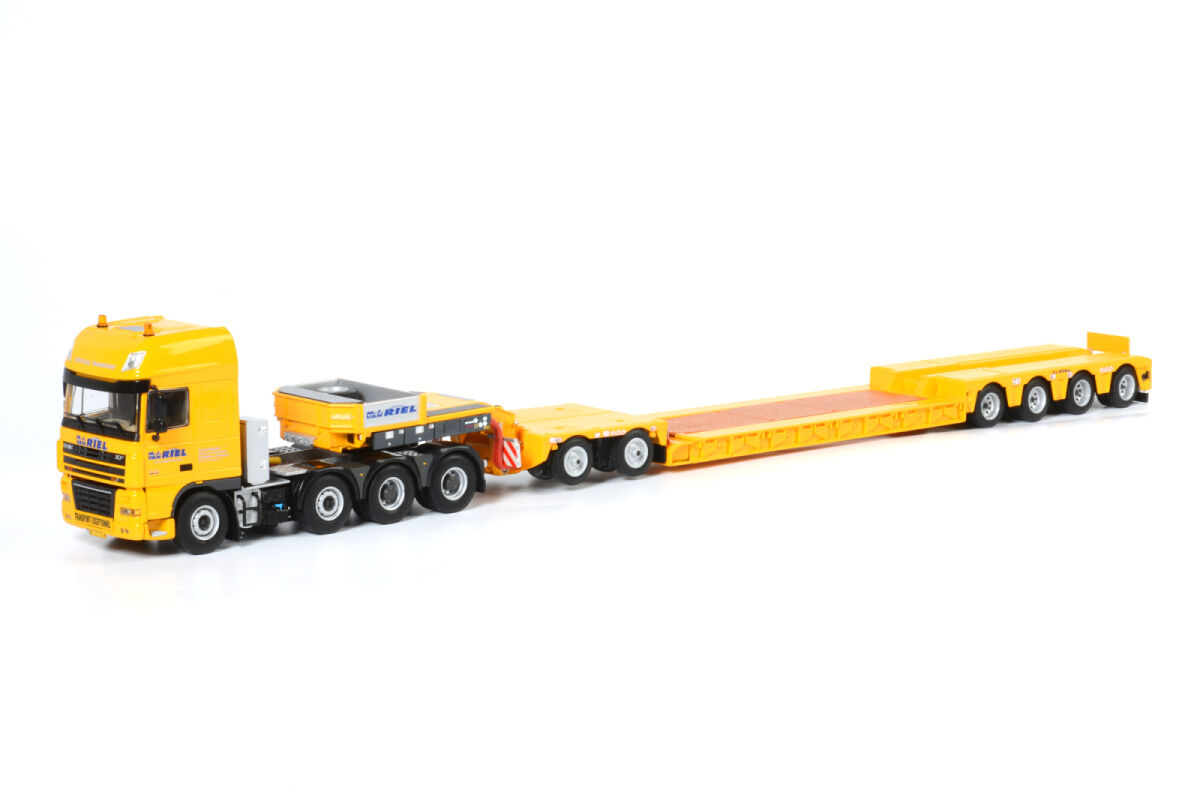 de WSI 1:50 schaalmodel van M.J. van Riel’s DAF XF 105 SSC 8×4 Eurodieplader met 4-assige trailer en 2-assige Interdolly mag niet ontbreken in jouw collectie! Dit gedetailleerde model is een eerbetoon aan het indrukwekkende transportmaterieel van M.J. van Riel, een gevestigde naam in zwaar en speciaal transport.